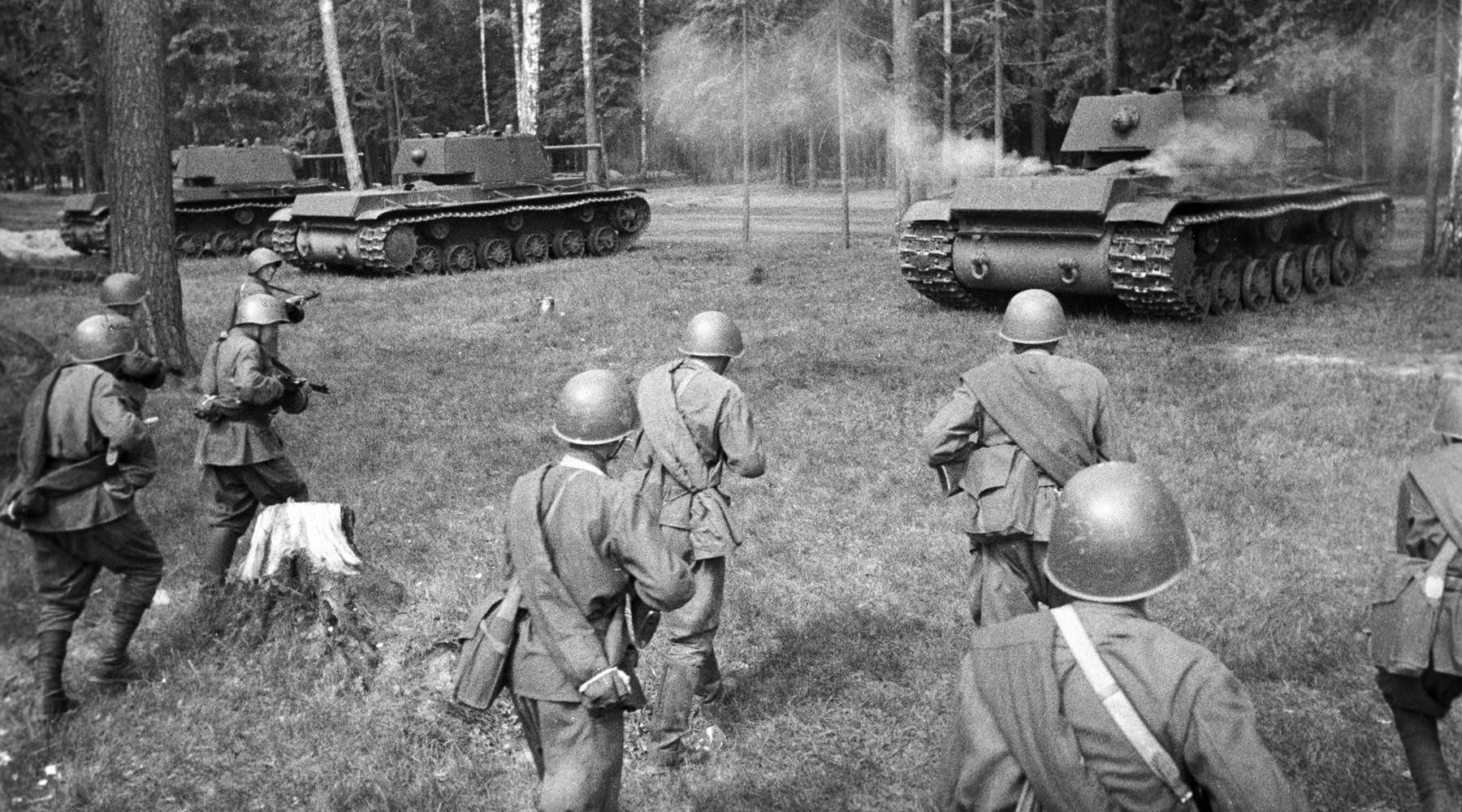 - Советские тяжёлые танки КВ-1 выходят на позицию для атаки.