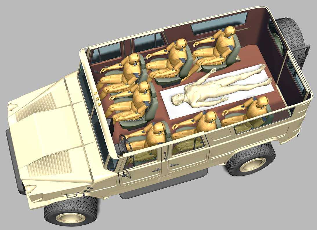 Армейская машина имеет заднюю грузопассажирскую площадку, с откидными сидениями, накрываемую тентом. Как и положенно военной машине она оборудована лебедкой и системой подкачки колес.