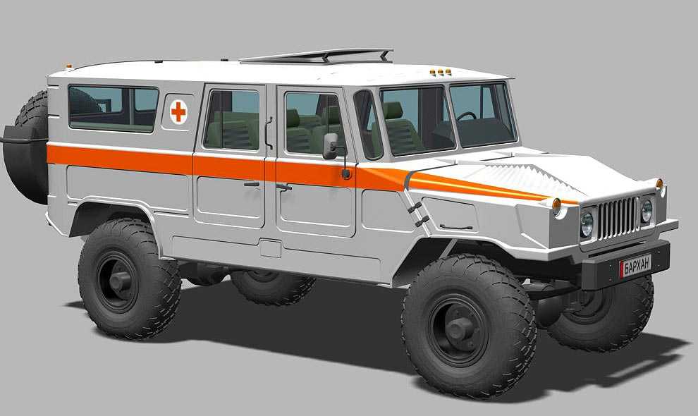 Возможен вариант кузова и без верхней надстройки и специального оборудования. Этот «Бархан» используется как машина дополнительного медицинского сопровождения. Равно как и все версии, машина может быть оснащена «подкачкой» колес и лебедкой.