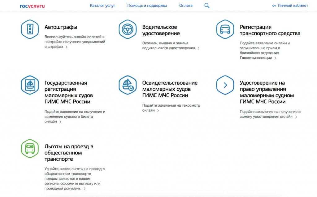 - Отыскать опцию под названием «Регистрация ТС». Она находится в категории «Транспорт и вождение». Можно для облегчения процесса воспользоваться поисковой строкой.