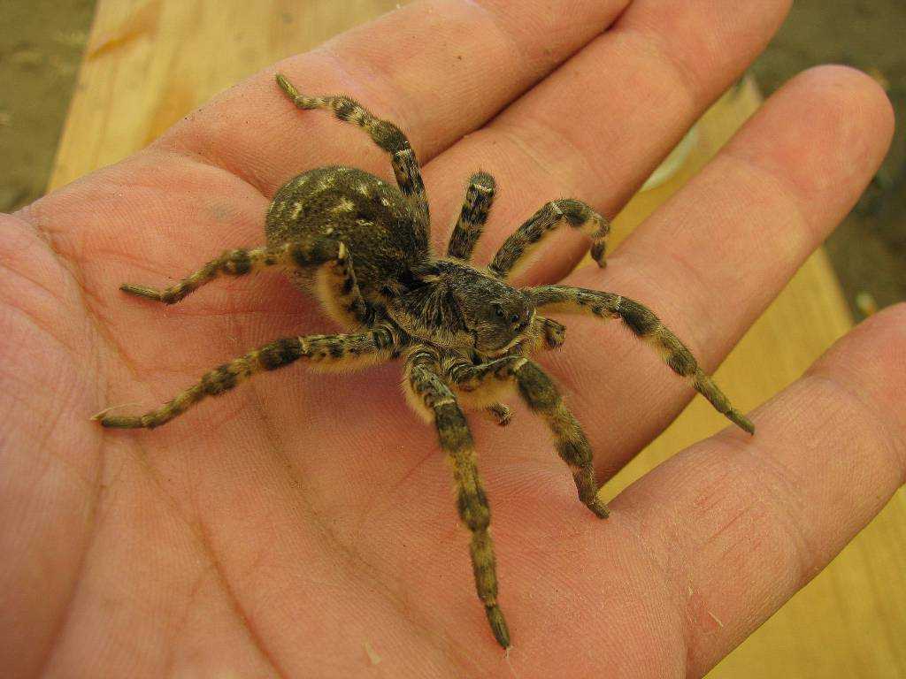 Тарантул (Lycosa) – род крупных ядовитых пауков из семейства пауков-волков. Тарантулы распространены на обширных территориях, живут в жарких и засушливых районах степей и пустынь. В Крыму тарантул встречается практически повсеместно. Этот крупный ядовитый паук зачастую имеет серый окрас. Существуют тарантулы разных видов. Наиболее распространён и часто встречается в мире апулийский тарантул (Lycosa tarantula). В России самым известным является южнорусский тарантул (Lycosa singoriensis), он на фото. Ядовитый паук тарантул довольно крупных размеров может выглядеть грозно и пугающе, и хоть он и не смертельно опасен, но лишний раз этого паука лучше не трогать, дабы не испытать укус тарантула на себе.