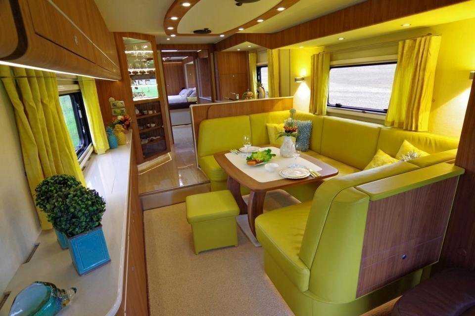 Как правило, все дорогостоящие автодома на колесах имеют роскошный внутренний интерьер, хорошие мраморные полы, телевизоры с плоским экраном, встроенную кухонную и спальную мебель, а также холодильники со встроенным генератором льда и многое чего другое.