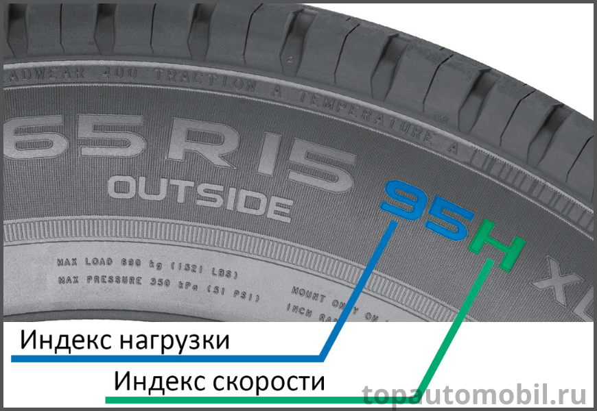 На усиленных покрышках дополнительно наносятся буквы XL или надпись Extra Load. При наличии одного из таких обозначений, необходимо индекс нагрузки (см.таблицу) увеличить на три пункта. Например, на покрышке с индексом нагрузки 100 максимальная грузоподъемность на каждое колесо 800 кг, а у резины с дополнительным показателем XL – 875 (что соответствует строчки показания 103).