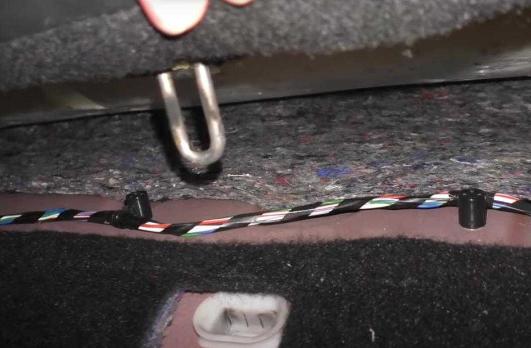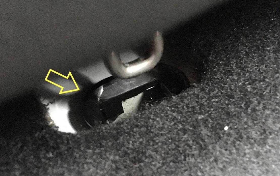 - Чтобы установить металлический кронштейн потребуется немного подрезать ковролин. Необходимые отверстия в кузове есть.