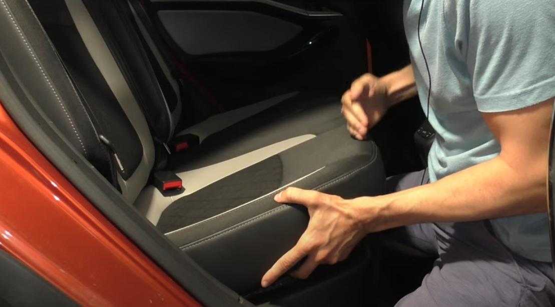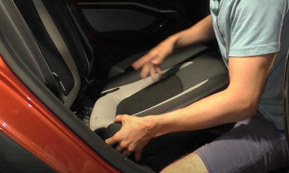 - Приподнимите сидушку заднего сиденья до характерного щелчка – это петли вышли из зацепления. Надавите на эту подушку и толкните ее в сторону багажника.