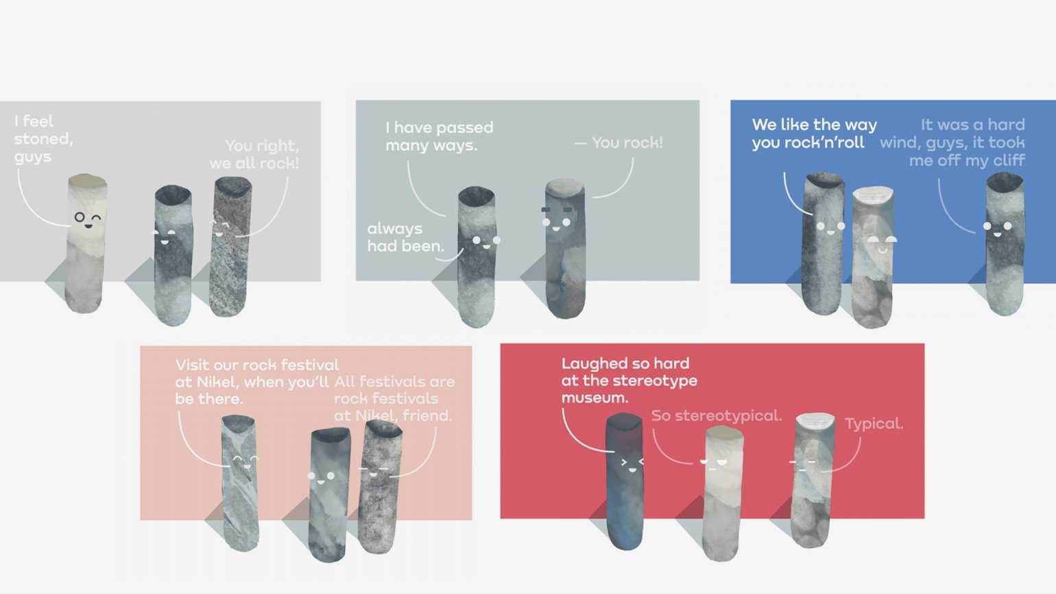 Если подниметесь на сопки, которые окружают Никель, под ногами увидите керн, ― пробы горной породы. Керн ― это тоже часть идентичности посёлка: геологической и исторической. Мы подумали, что здорово сделать из этого коммуникацию. Так нашли идею для персонажей ― это Керны. Они могут шутить и общаться друг с другом на разных языках.