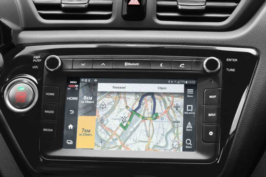 Сначала ни у одной комплектации Киа Рио 3 на российском рынке не было штатной магнитолы с навигацией. Если у водителя есть желание можно было заказать опцию у дилера. В этом случае машина будет укомплектована нештатной магнитолой с навигацией. Дилеры ставят на Киа Рио 3 устройства с навигации от производителя в Китае. Никаких нареканий по качеству у автолюбителей нет. Некоторые собственники ТС самостоятельно устанавливают навигации, однако стоит заранее взвесить все за и против. Приложение может строить маршрут и узнавать о состоянии на дорогах. Картографические данные постоянно обновляются.