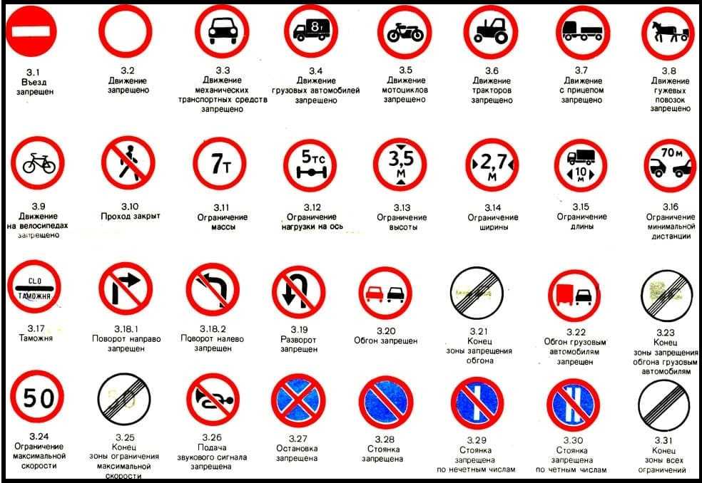 Как понятно из названия группы, знаки запрещают водителю совершить какое-либо действие: проехать, повернуть, обогнать, разогнаться, остановиться. Все запрещающие знаки имеют круглую форму.