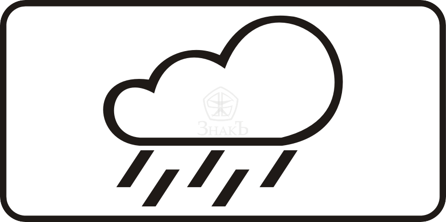 В соответствии с ПДД, официальное название этой таблички «Дорожный знак 8.16. Влажное покрытие». На нём черными круговыми линиями изображено облако с пятью прямыми линиями, символизирующими дождь, грозу или ливень. Существует заблуждение о том, что данный знак предупреждает об ограничении скорости во время дождя. И хоть эта идея отчасти отражает его настоящее назначение, в некоторых аспектах она не верна.
