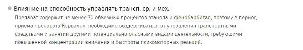 Тут же, в инструкции, указываются ограничения к применению корвалола. И одним из таких ограничений является способность садиться за руль транспортных средств: