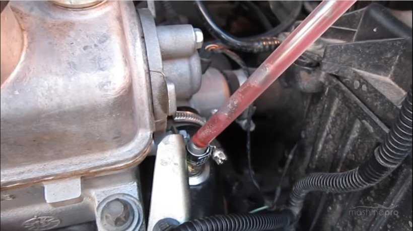 - Открутить пробку расширительного бачка и сильно подуть в него до вытекания тосола из снятого патрубка.