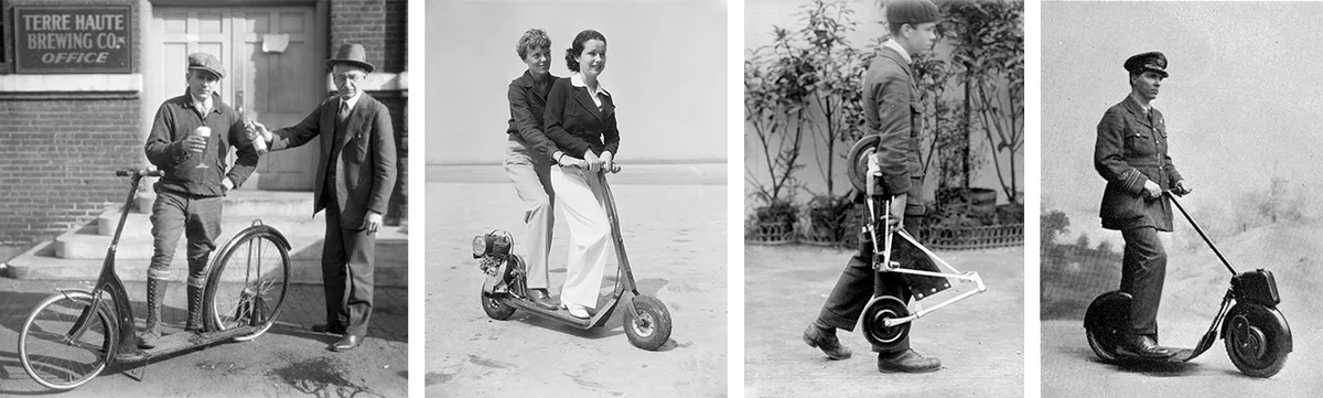Создание складных моделей датируется 1917 годом. Они имели три колеса, которые совпадали по размерам. При этом конструкция напоминала современную. В 1925 году третье колесо убрали, а деку сделали уже и длиннее. В 1941 году дека опять стала короче. Также изменили метод фиксации колес.