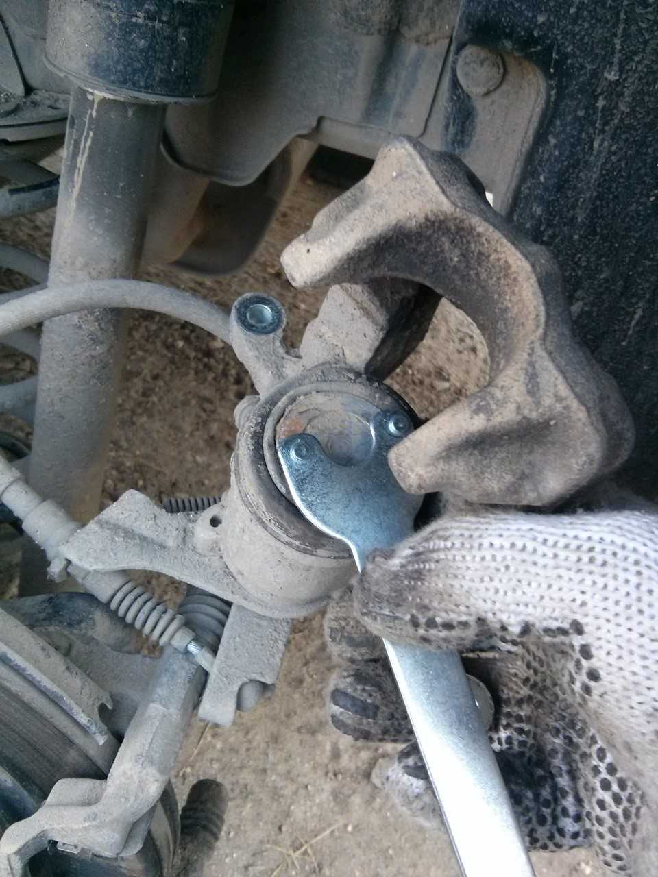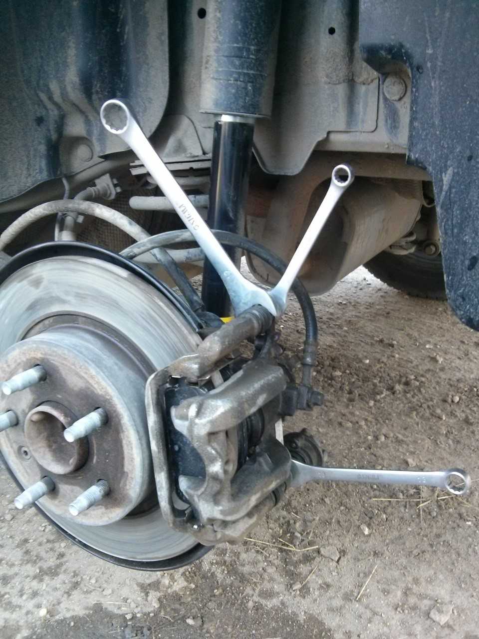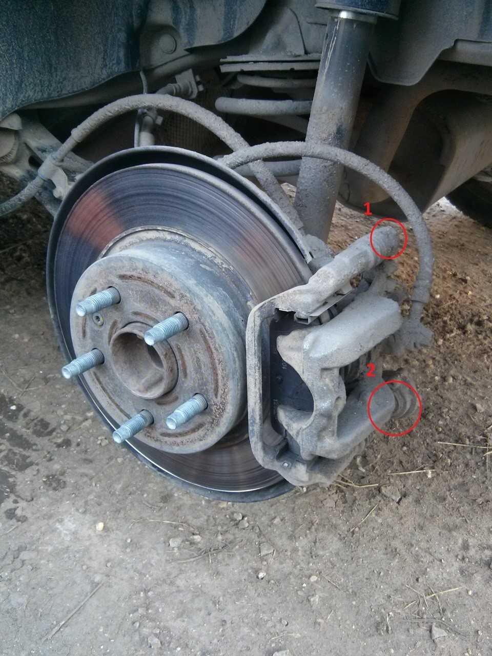 При помощи ключей «на 10» и «на 13» открутить два болта на суппорте. В случае, если их не удается сорвать с места, рекомендуется обработать посадочное место проникающей смазкой, например, WD-40.