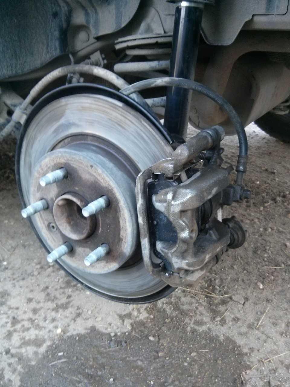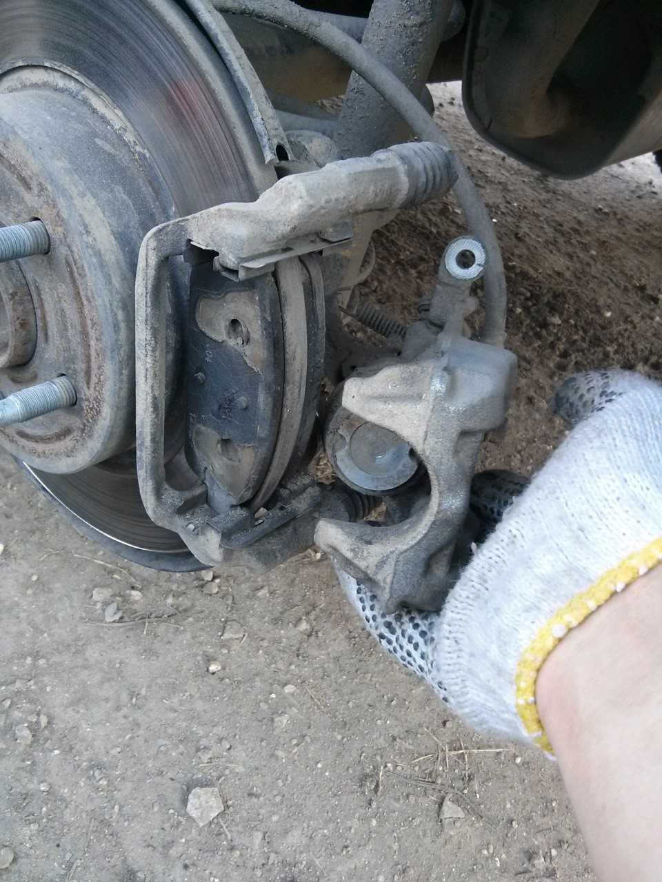 Отвести суппорт в сторону. Для предотвращения повреждения тормозной магистрали рекомендуется закрепить его на проволоке или положить на подпорку.