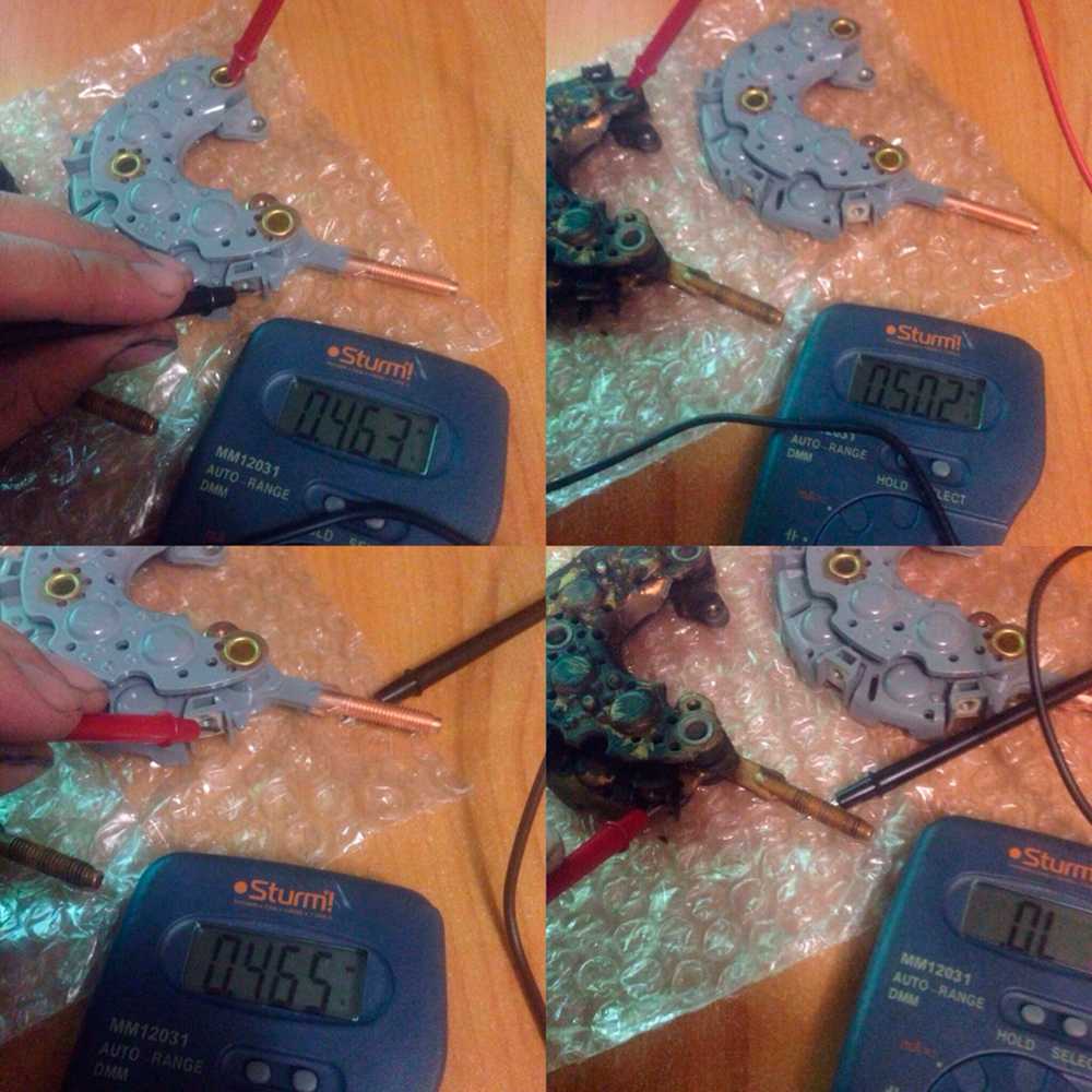 - Проверить исправен ли выпрямительный блок. Для этого следует подсоединить один щуп к массе выпрямителя, а вторым дотронуться вывода диода. Блок должен пропускать либо не пропускать ток.