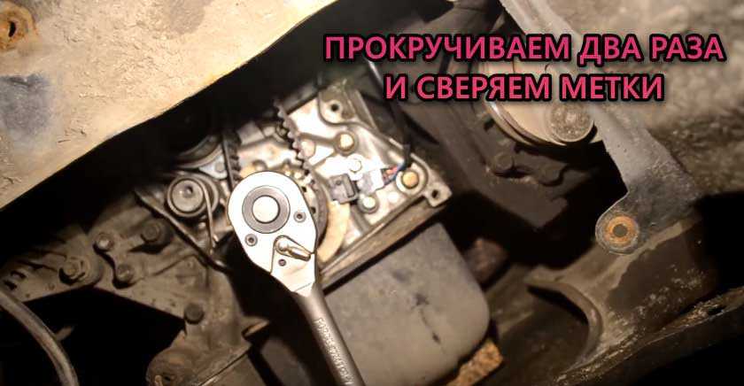Проворачивая колесо, делаем два оборота коленчатого вала, устанавливаем его по метке и смотрим, совпала ли она с наплывом на распределительном валу.