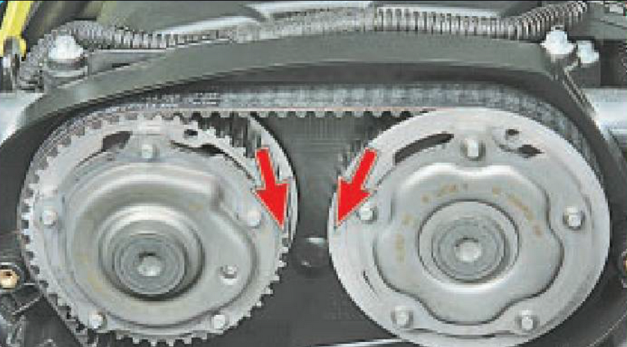 Проверьте совпадение установочных меток коленчатого и распределительных валов. При несовпадении повторите установку ремня. Установите все ранее снятые детали в последовательности, обратной снятию.