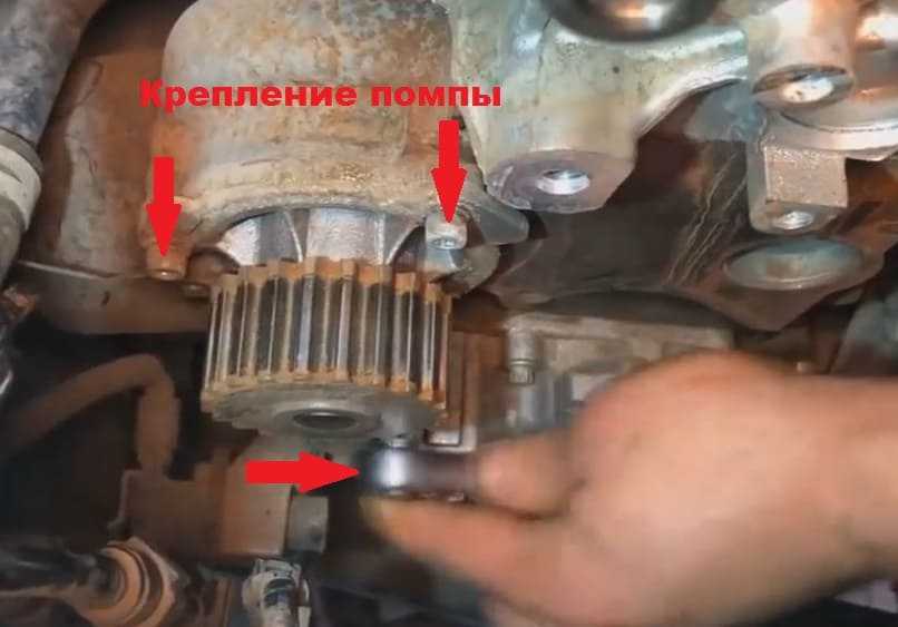 Ключом Т30 выкручивается 3 болта, крепящие помпу на двигателе. Для этого используйте малую трещотку. Помпа извлекается вместе со старой прокладкой. Поскольку остатки антифриза продолжат стекать, внизу нужно поставить поддон. Удаляются остатки старой прокладки, посадочное место тщательно зачищается.