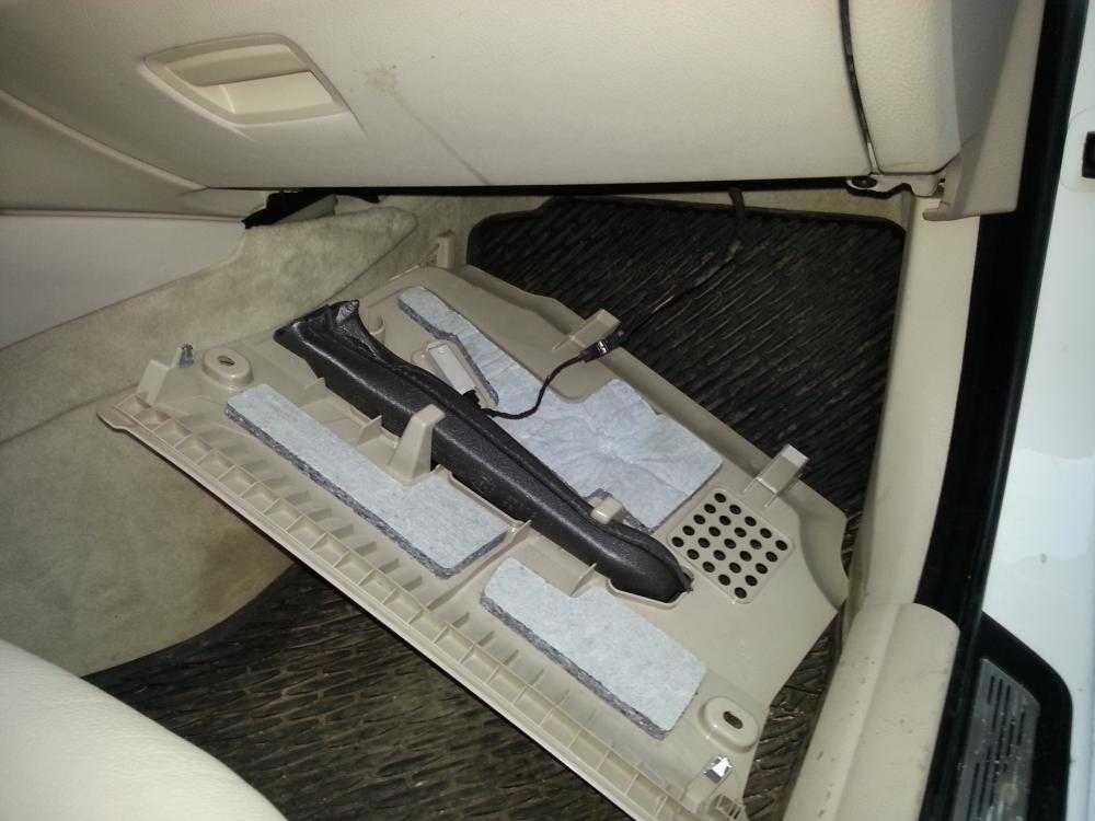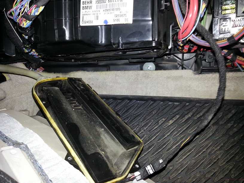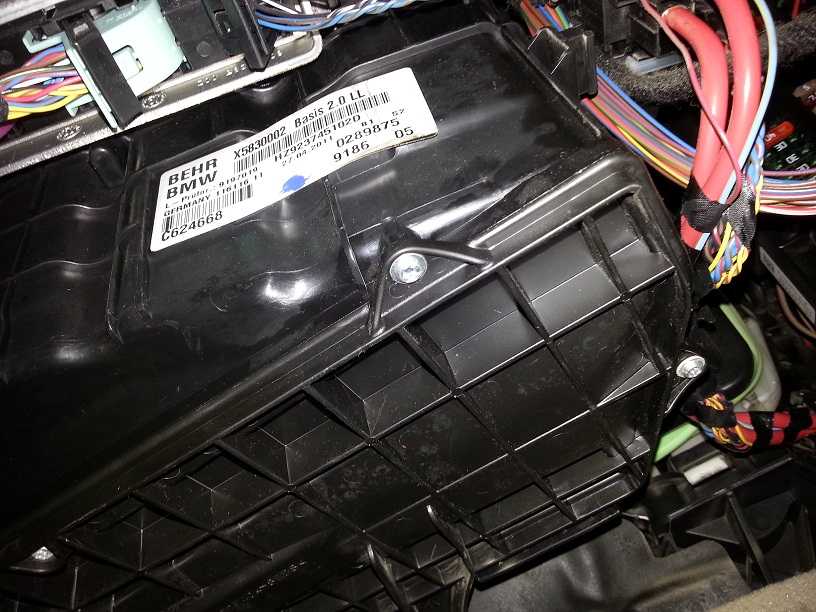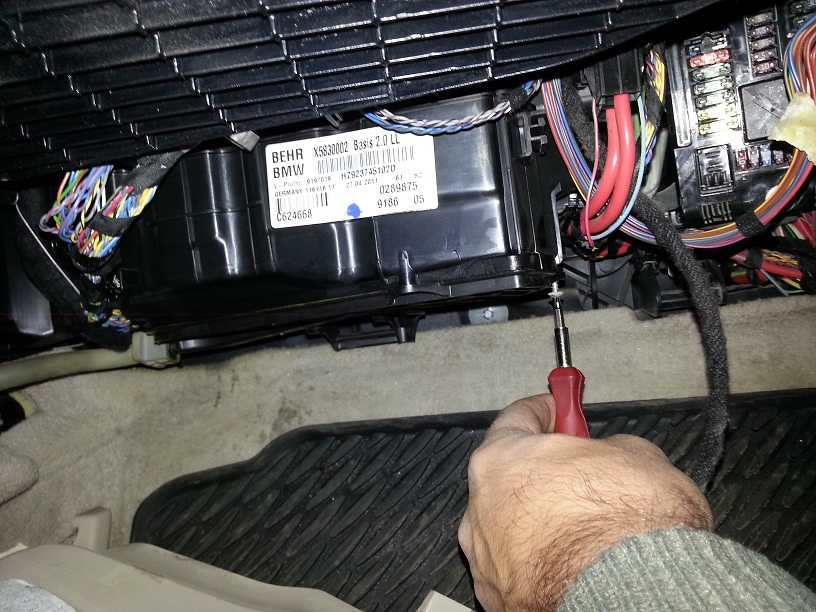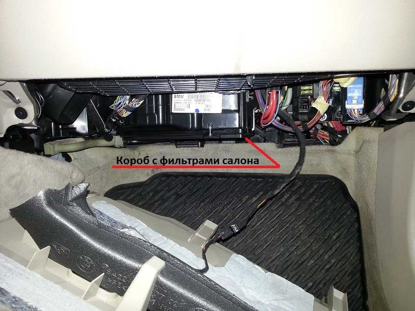 Поиск фильтров салона на BMW 5 серии следует начать под бардачком. Заранее наденьте рабочую одежду и подстелите под ноги перед пассажирской дверью картонку, так как замена фильтра – дело грязное. Заглянув под бардачок, вы обнаружите там прикрученную пластиковую панель. Прикручена она на 2 самореза внизу бардачка и на 1 саморез сбоку (см. фото). Отвинчиваем каждый по очереди. После того, как саморезы откручены, аккуратно снимаем эту пластиковую панель. Снизу она сидит на защелках, а слева сбоку ее держит обивка пола салона. Начать лучше со стороны обивки, где вы открутили боковой саморез, а затем отщелкнуть верх панели