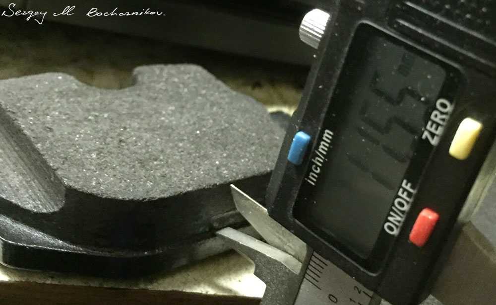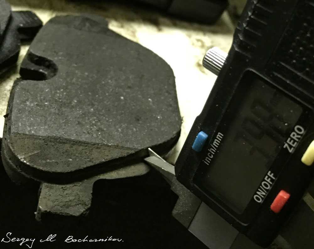 Толщина новой тормозной накладки — чуть меньше 12 мм, а «полностью изношенной» — 4 мм. То есть износ составил 2/3 или 66%. По-хорошему, только в этот момент машина должна бы зажечь ненавязчивое предупреждение вида «запланируйте в ближайшие месяц-два визит на сервис», а не переходить к шантажу и угрозам.
