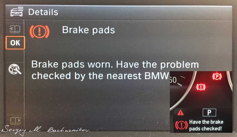 И, чтобы доход от сервиса не падал слишком низко, надо народ стимулировать на этот самый сервис ездить. А то что это получится — раз в год на замену масла и фильтров? Не-ет, так денег не заработаешь. Масло будем менять, скажем. раз в 10 тысяч километров, да еще и попросим компьютер сокращать этот интервал «в зависимости от манеры вождения». Ну а тормозные колодки, вроде как, по датчику надо менять. Стерся фрикционный слой — загорелась лампочка — в сервис.Но это в идеальном мире. В реальном мире лампочка зажигается когда износ колодок едва перешел за половину.Зная об этом, а также периодически осматривая колодки визуально, можно еще поездить. Хотя придется любоваться на неприятные надписи: