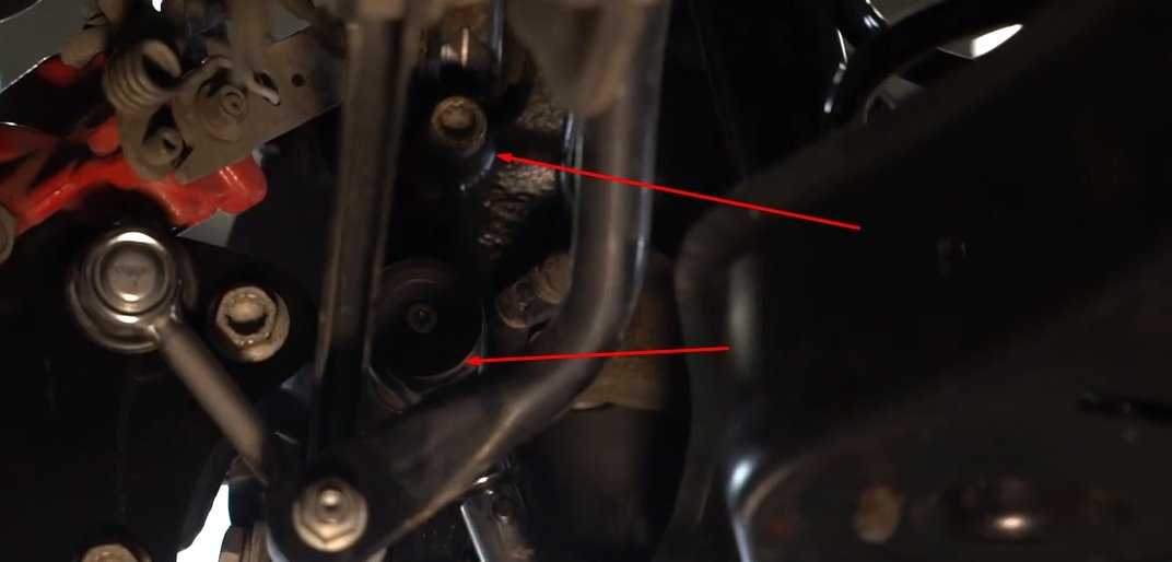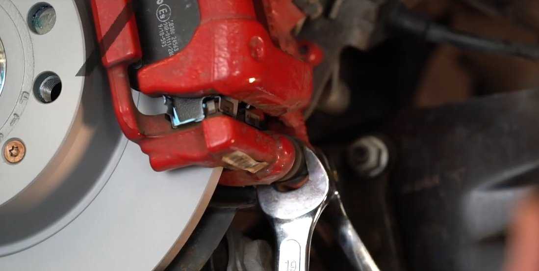 5. Ключом на 13 отворачиваем нижний болт крепления тормозного суппорта, придерживая вторым ключом на 15 направляющий палец за шестигранник. Извлекаем болт крепления тормозного суппорта.