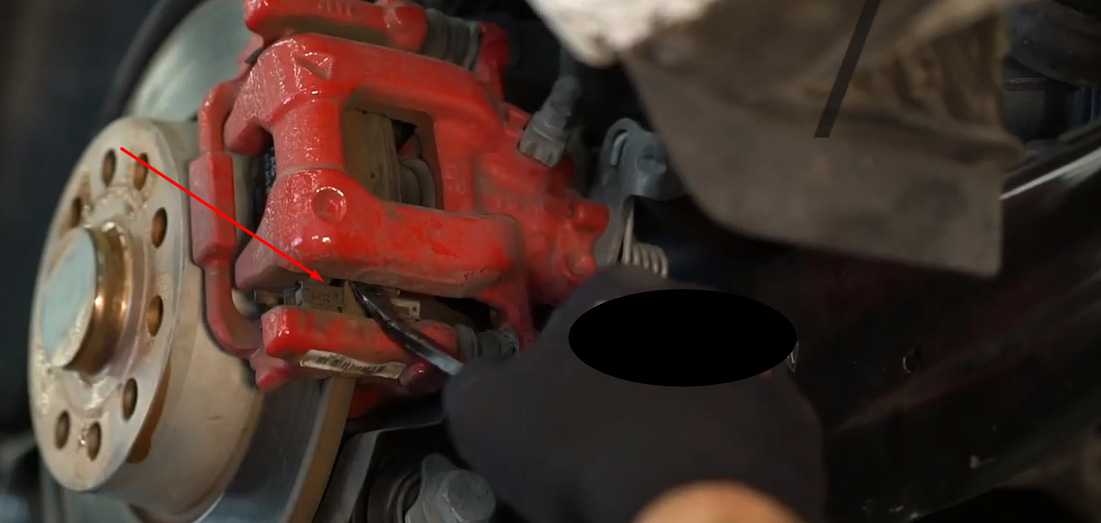 Внимание: — Тормозной суппорт необходимо подвешивать на прочной металлической проволоке или чем-либо подобном каждый раз, когда он будет снят с креплений, а гибкий тормозной шланг будет оставаться подсоединенным к нему. В случае невыполнение этого требования, на гибкий тормозной шланг будет действовать вес суппорта, что может привести к повреждению шланга, а затем к утечке тормозной жидкости