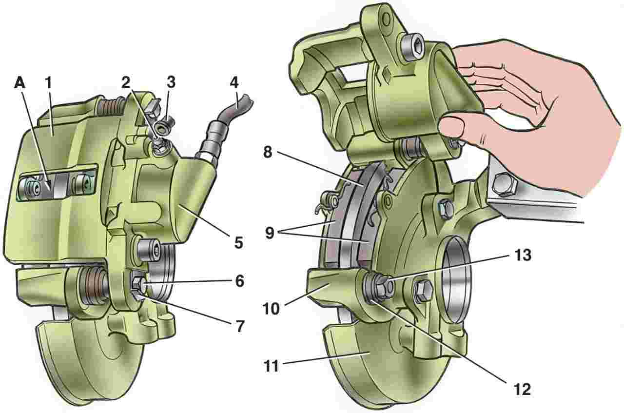 Тормозные механизмы передних колес дисковые, с однопоршневой плавающей скобой (при торможении поршень прижимает внутреннюю колодку к диску, а скоба, смещаясь в противоположном направлении, прижимает наружную).